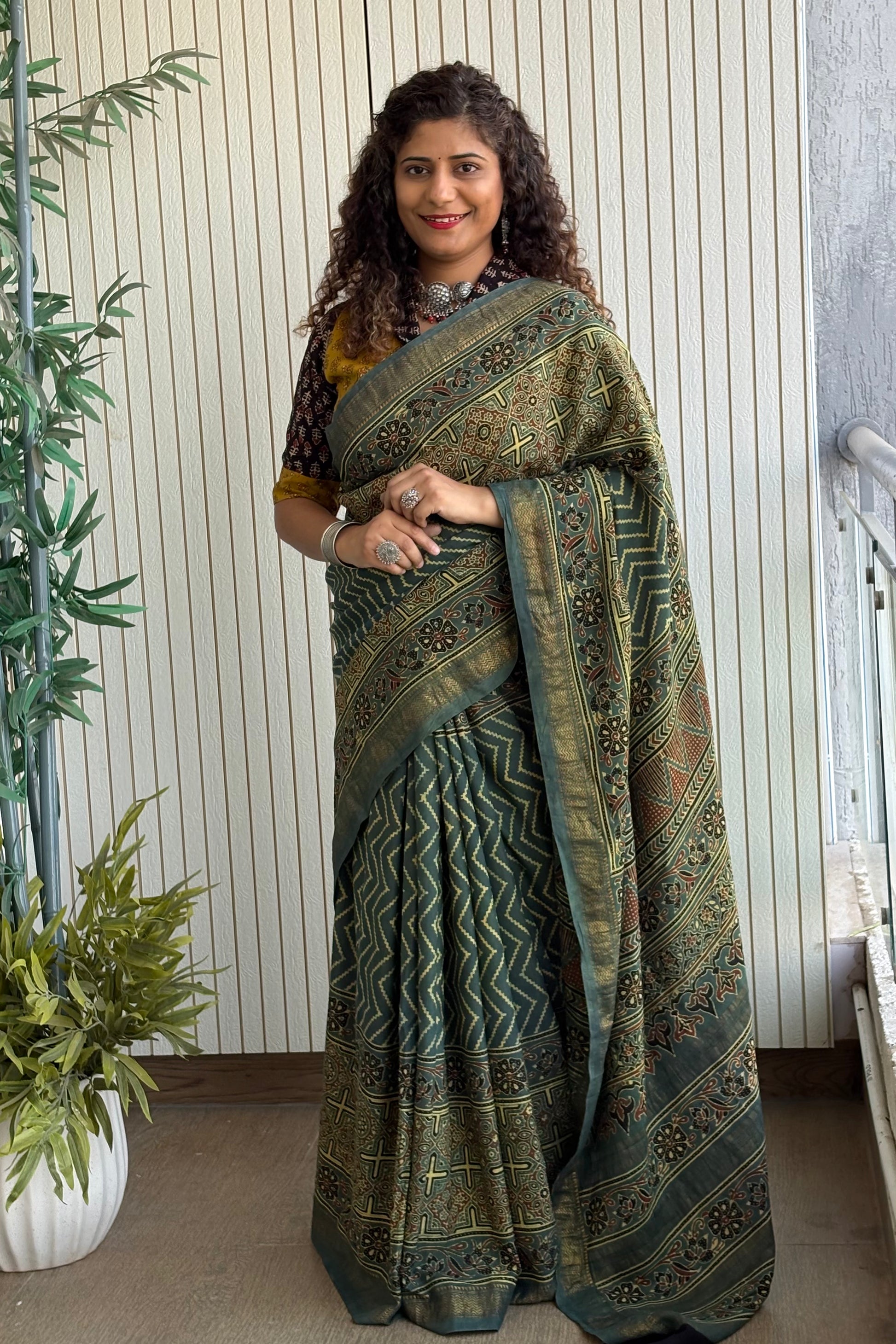Ajrakh Mulberry Natural Dye Hand Block Print Saree - Green