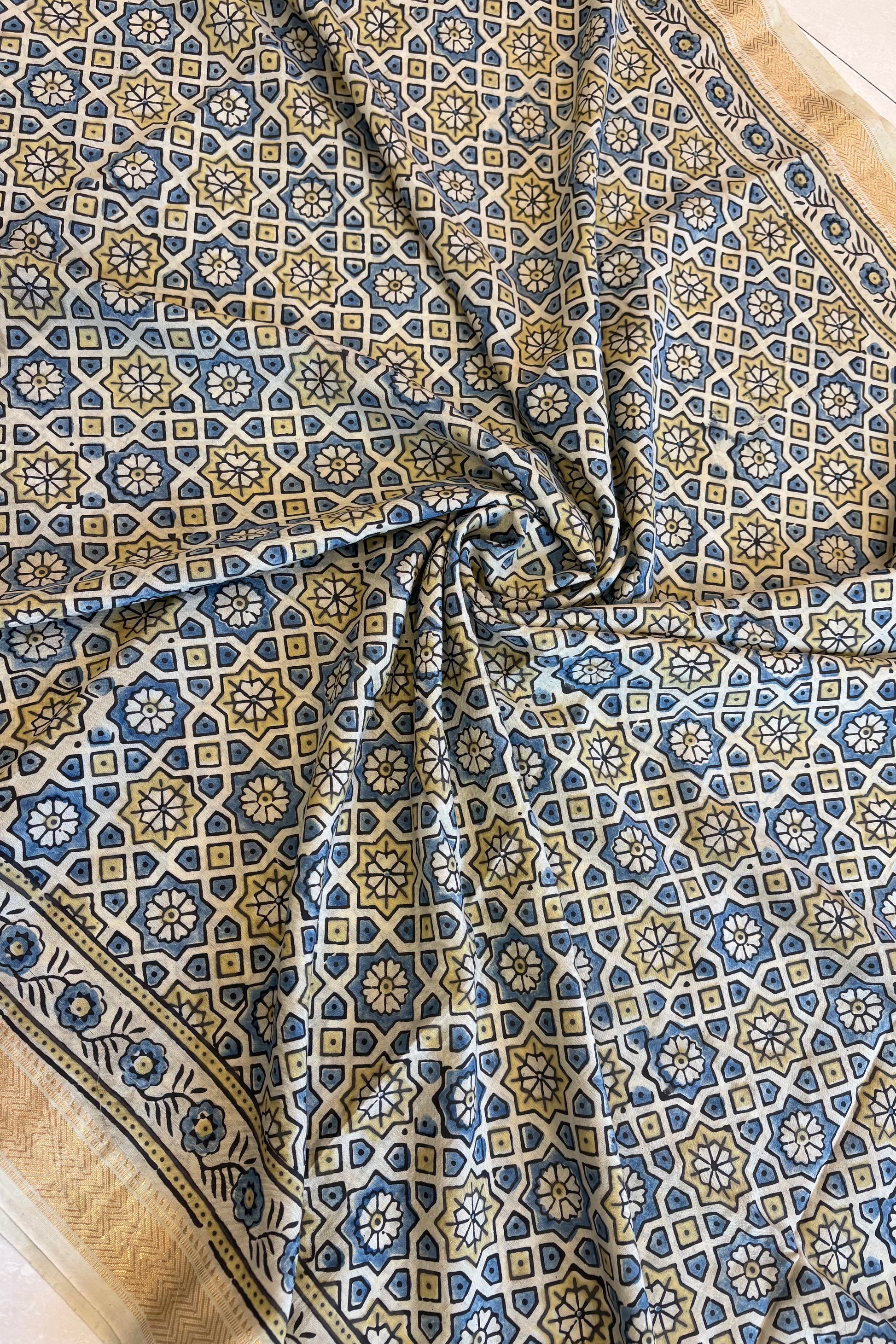 Ajrakh Mulberry Natural Dye Hand Block Print Saree - Beige