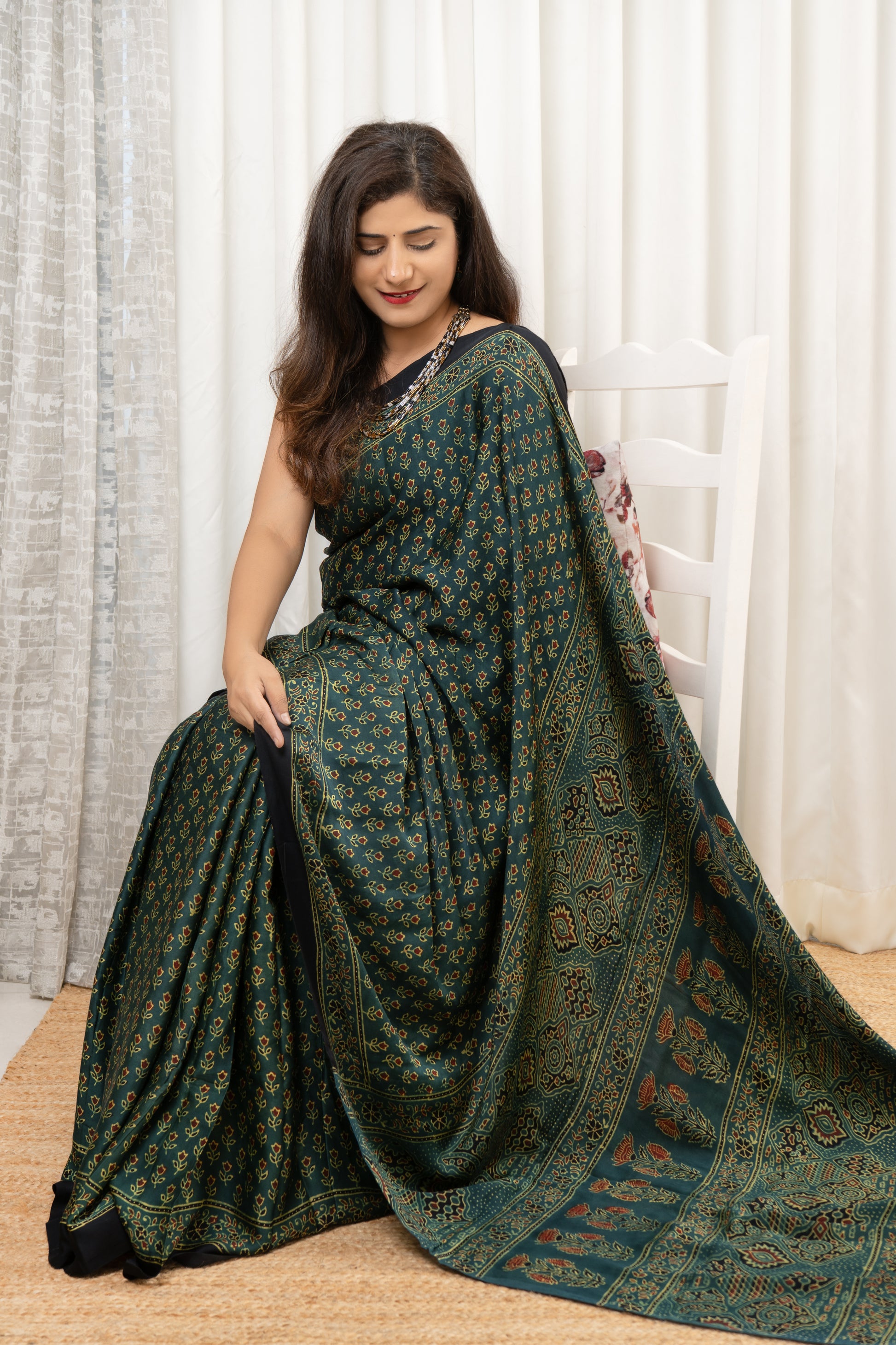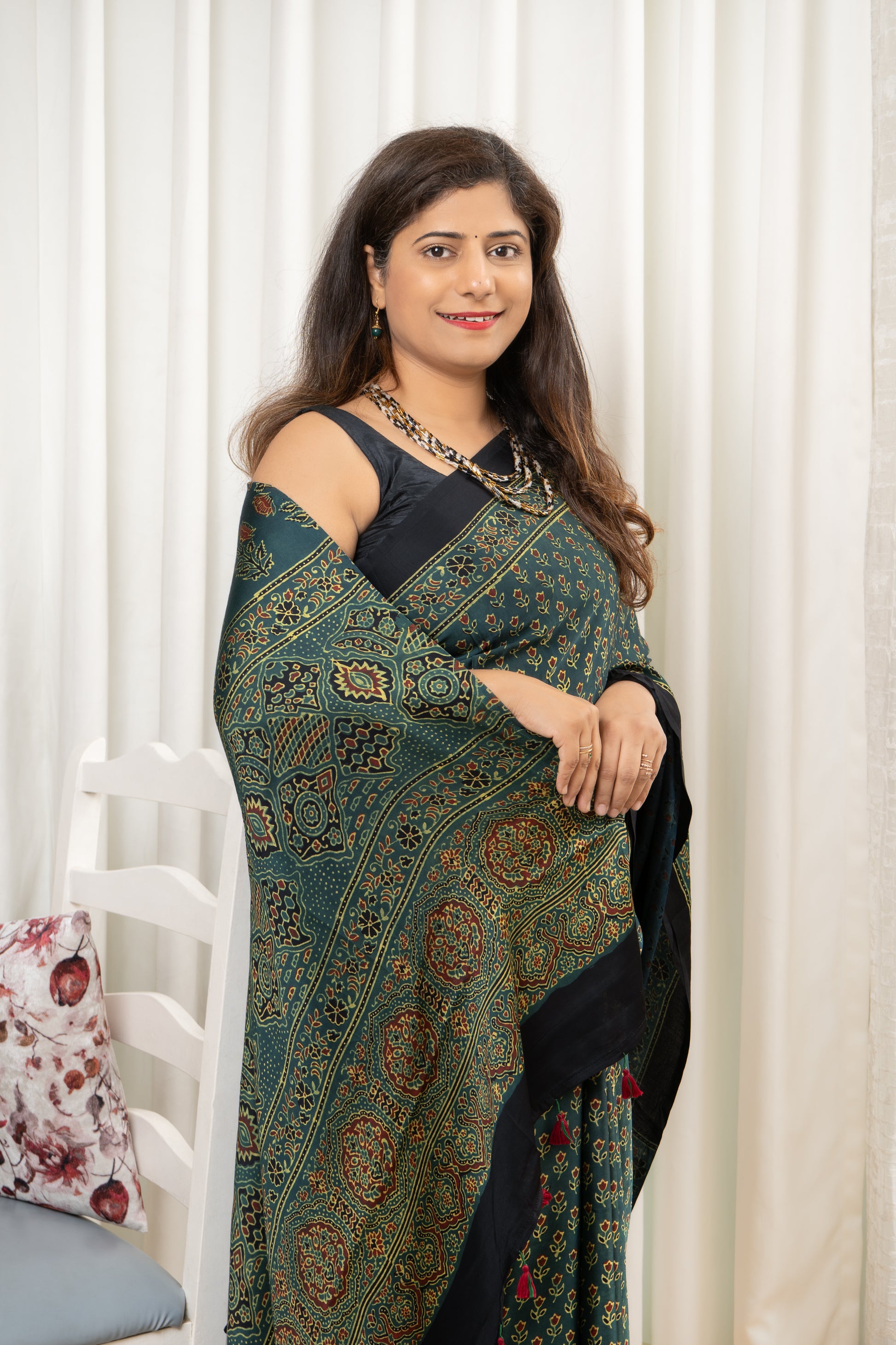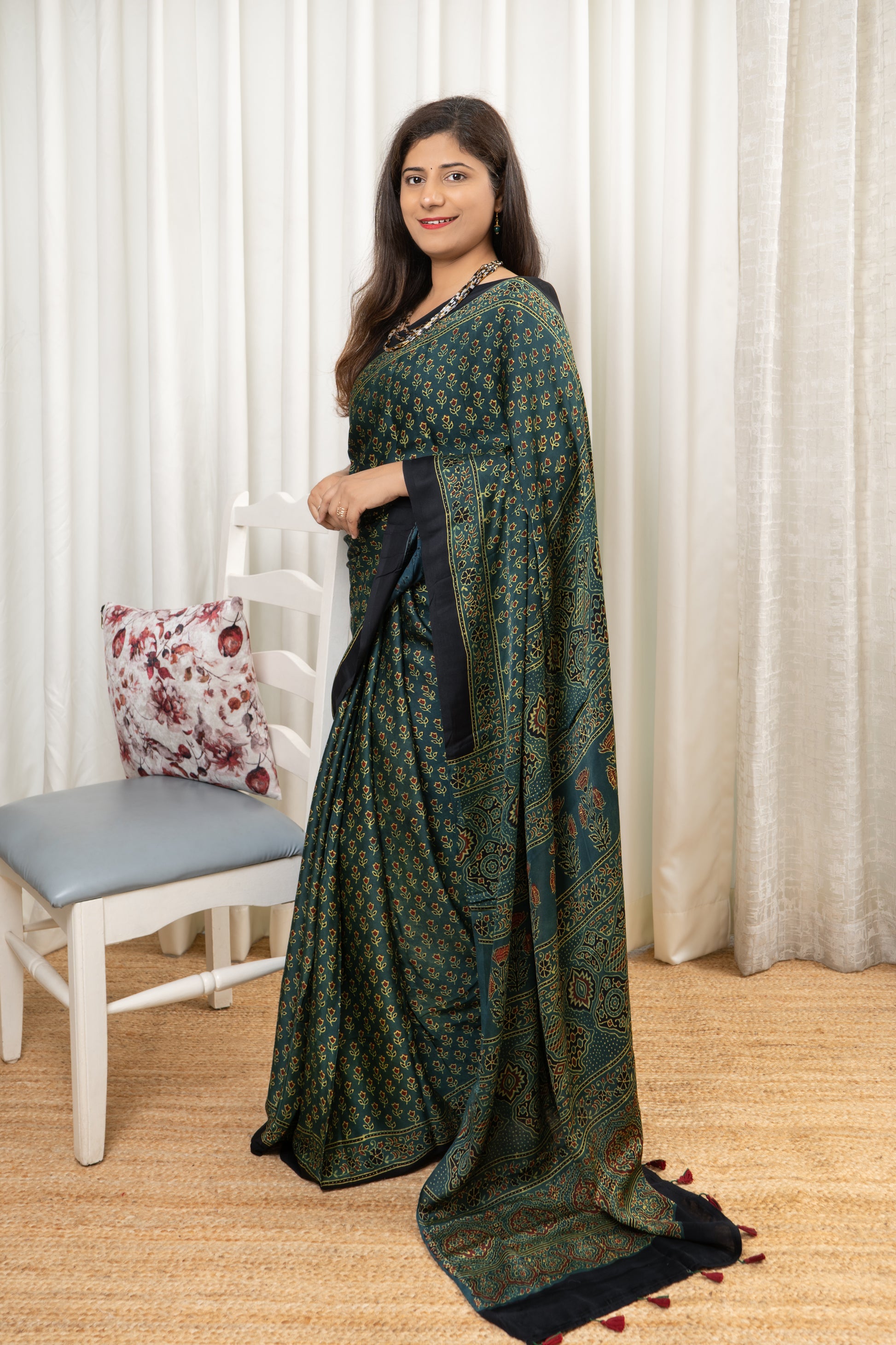 Elevate your wardrobe with the intricate Ajrakh hand block print on our luxurious Modal fabric. Feel the softness and see the stunning design, all while supporting traditional craftsmanship using natural dyes. Bring a touch of art and culture to your everyday style.
