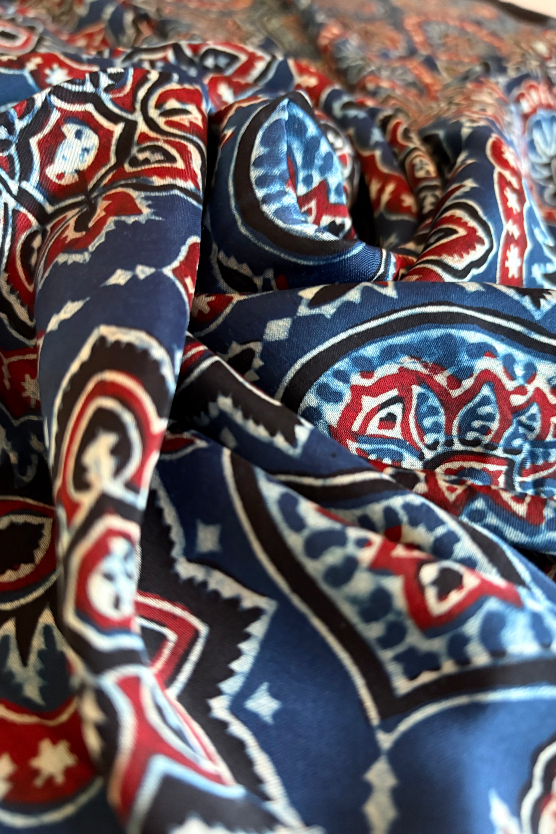 Elevate your wardrobe with the intricate Ajrakh hand block print on our luxurious Modal fabric. Feel the softness and see the stunning design, all while supporting traditional craftsmanship using natural dyes. Bring a touch of art and culture to your everyday style.