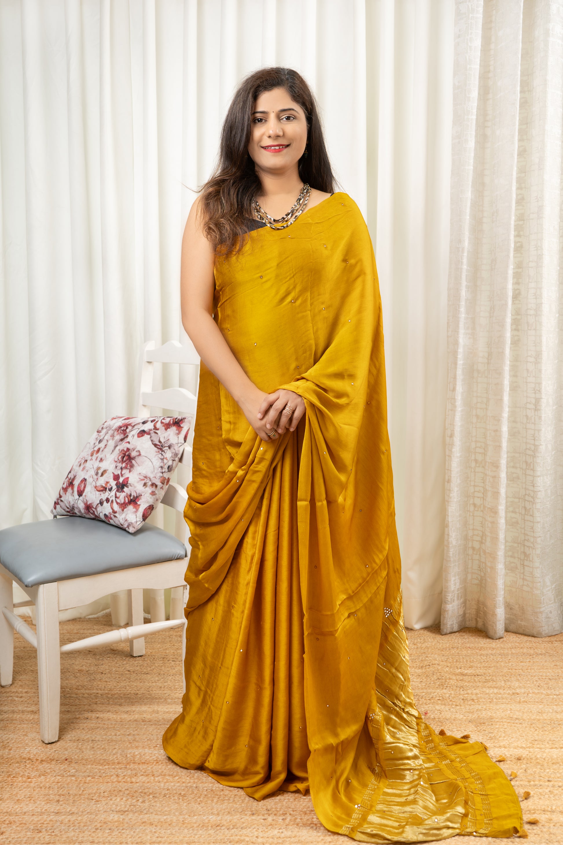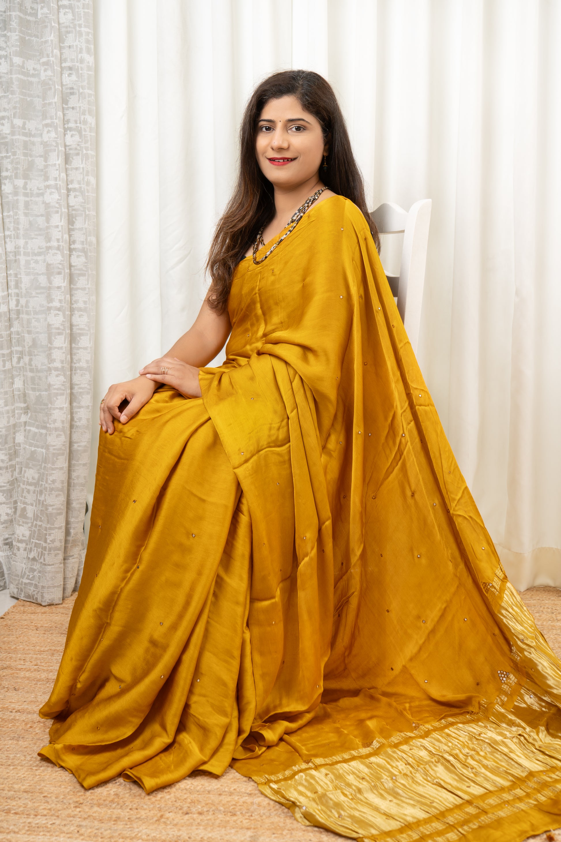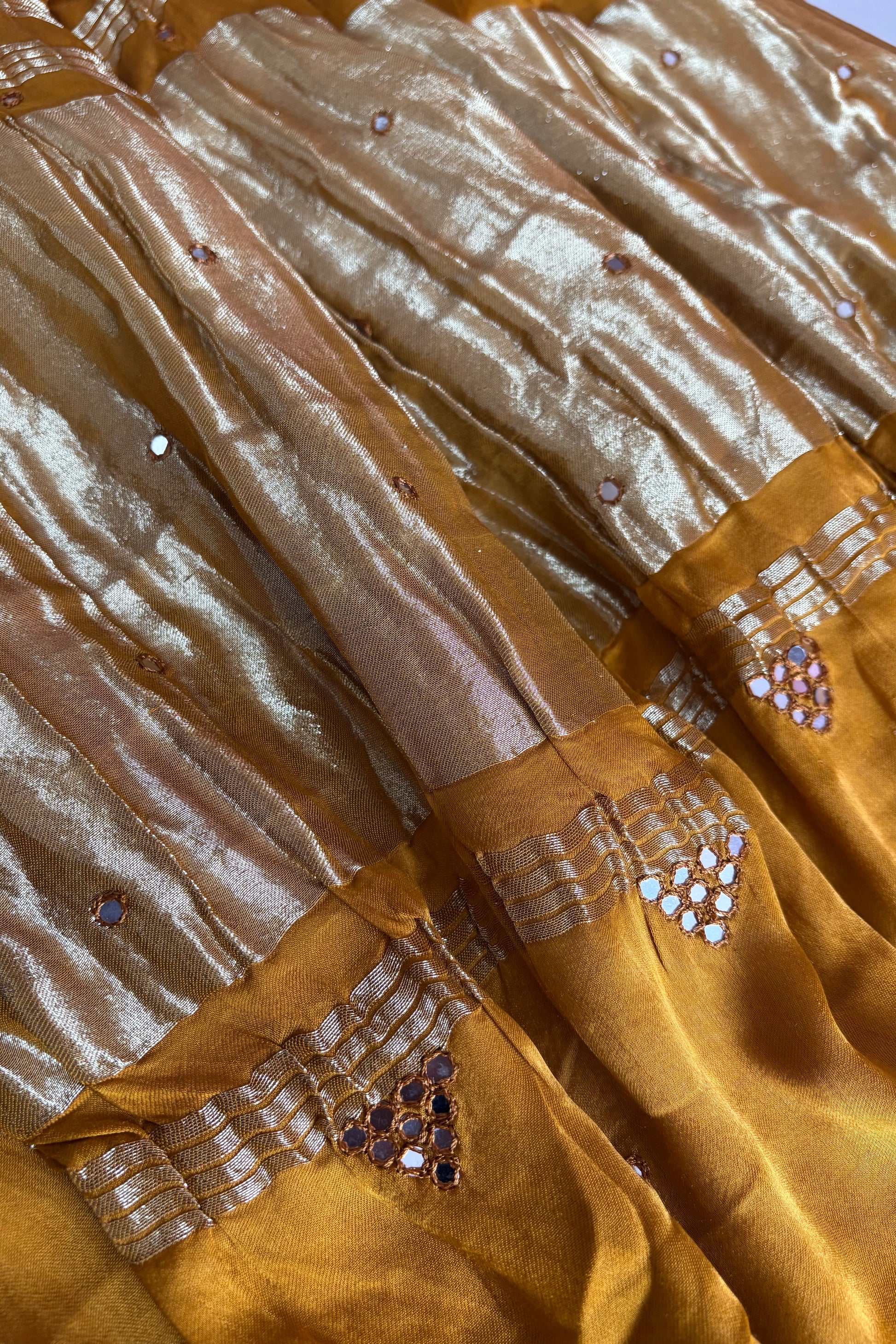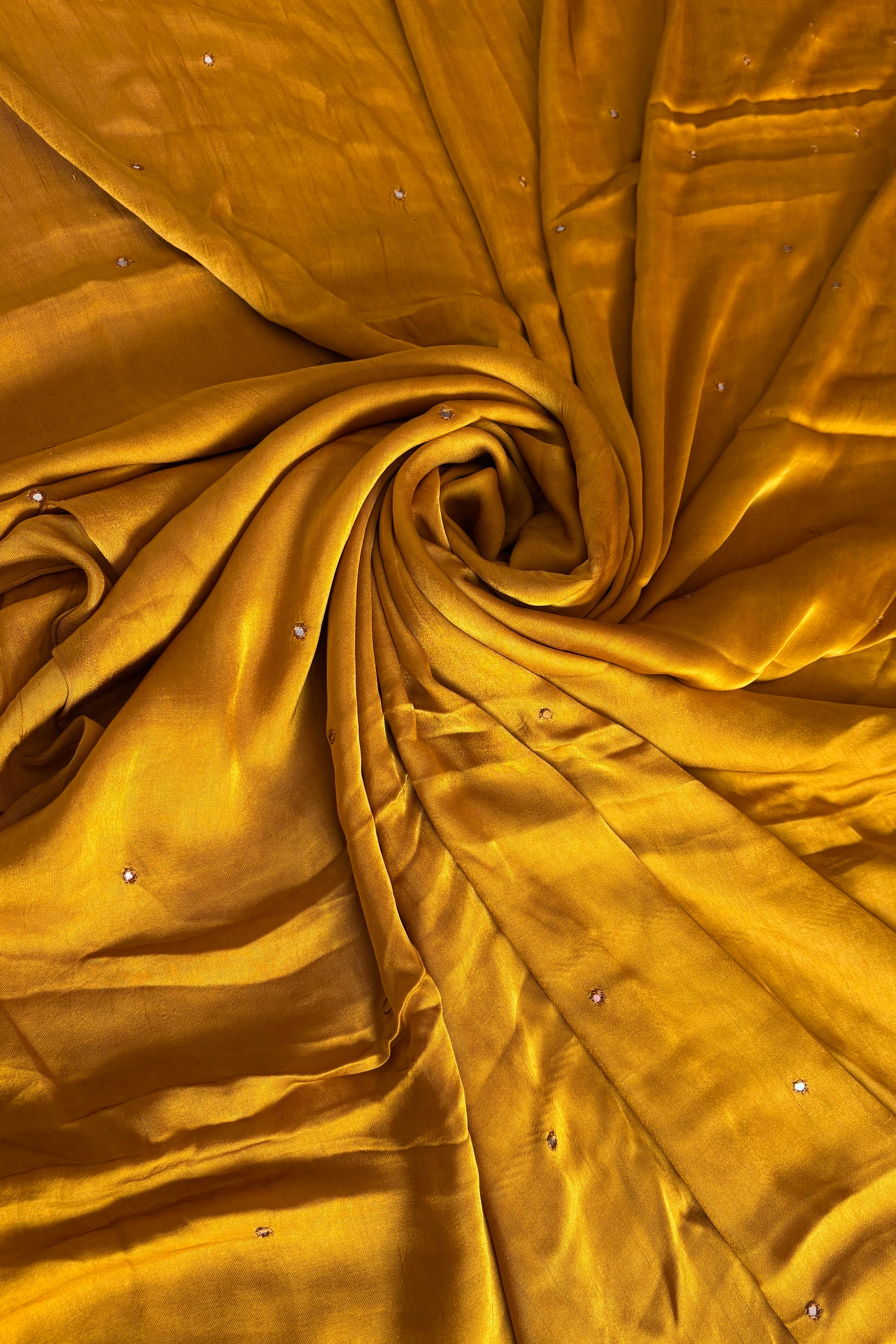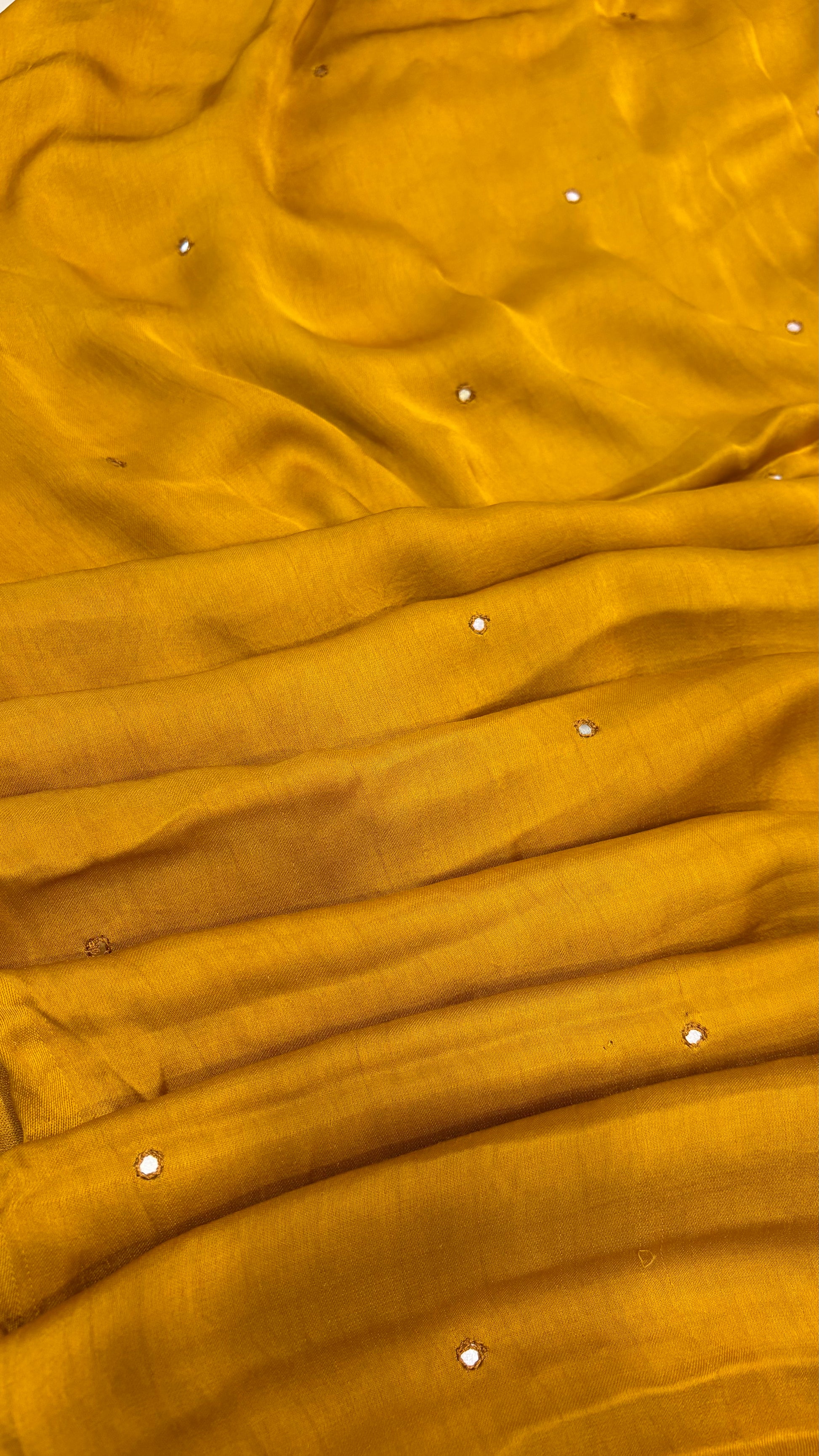 This Pure Modal Saree comes in a warm mustard-gold shade that looks rich and graceful. Skilled karigars have added hand-done mirror work all over the saree, giving it a soft festive shine without making it heavy. The tissue pallu with neat latkans adds a classy finish. The blouse also has matching mirror work for a complete look. This saree is comfortable to wear and works well for casual outings, small functions, or light party events, making it a smart and stylish choice.