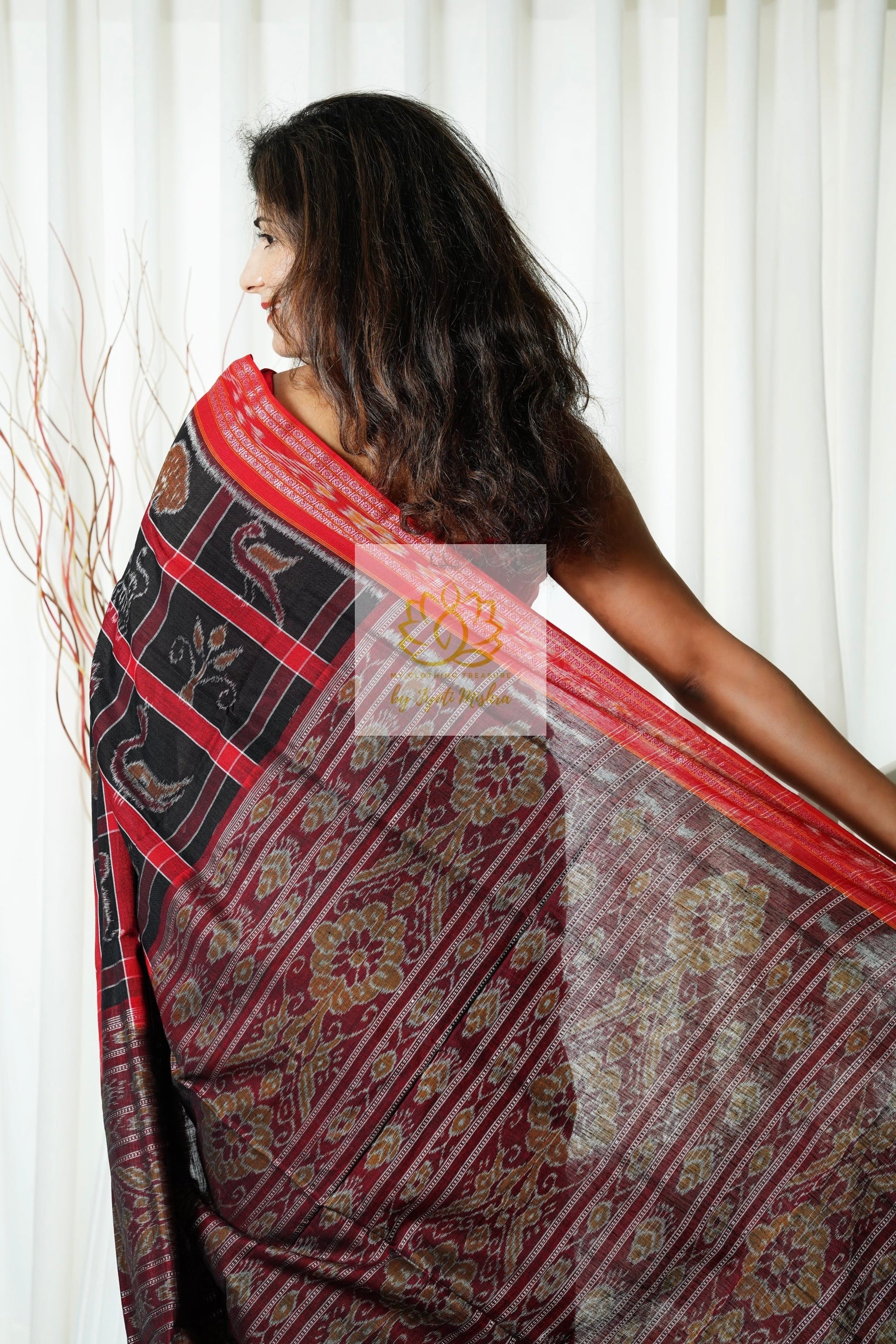 This particular piece is a Silk Nabakothi Khandua Cotton Saree on a black base with red border, again a combination inspired from Lord Jagannatha's face, who is also referred to as "Jaga Kalia" because of his colour.