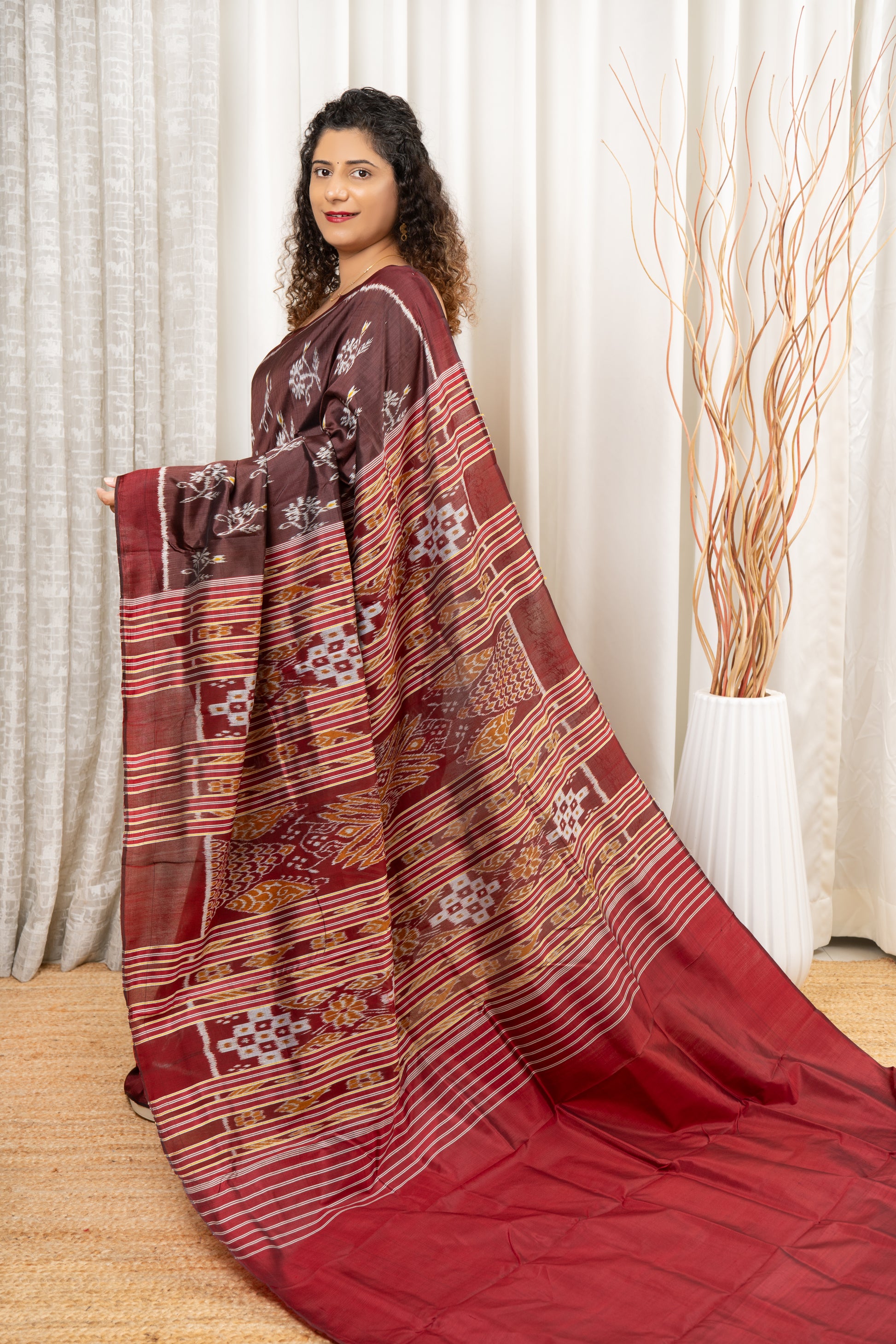 Exclusive Odisha Ikkat Pure Silk Saree in Coffee Brown with Floral Motifs & Maroon Border | Handwoven | Silk Mark Certified