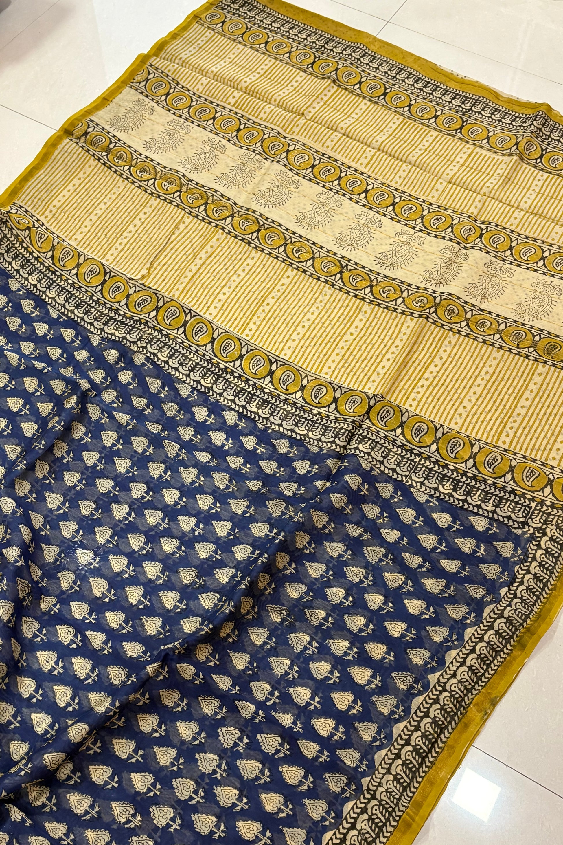 Traditional Bagru/ Bagh/ Ajrakh Hand Block Print on Silk-Cotton Saree sourced from artisans of Bagru, Sanganer, Jaipur, Rajasthan. A very comfortable weave, light weight, easy to maintain, this age old art of hand block printing has been a favorite with people worldwide because of this very reason. Some trends are there forever and Hand block print is one of those.