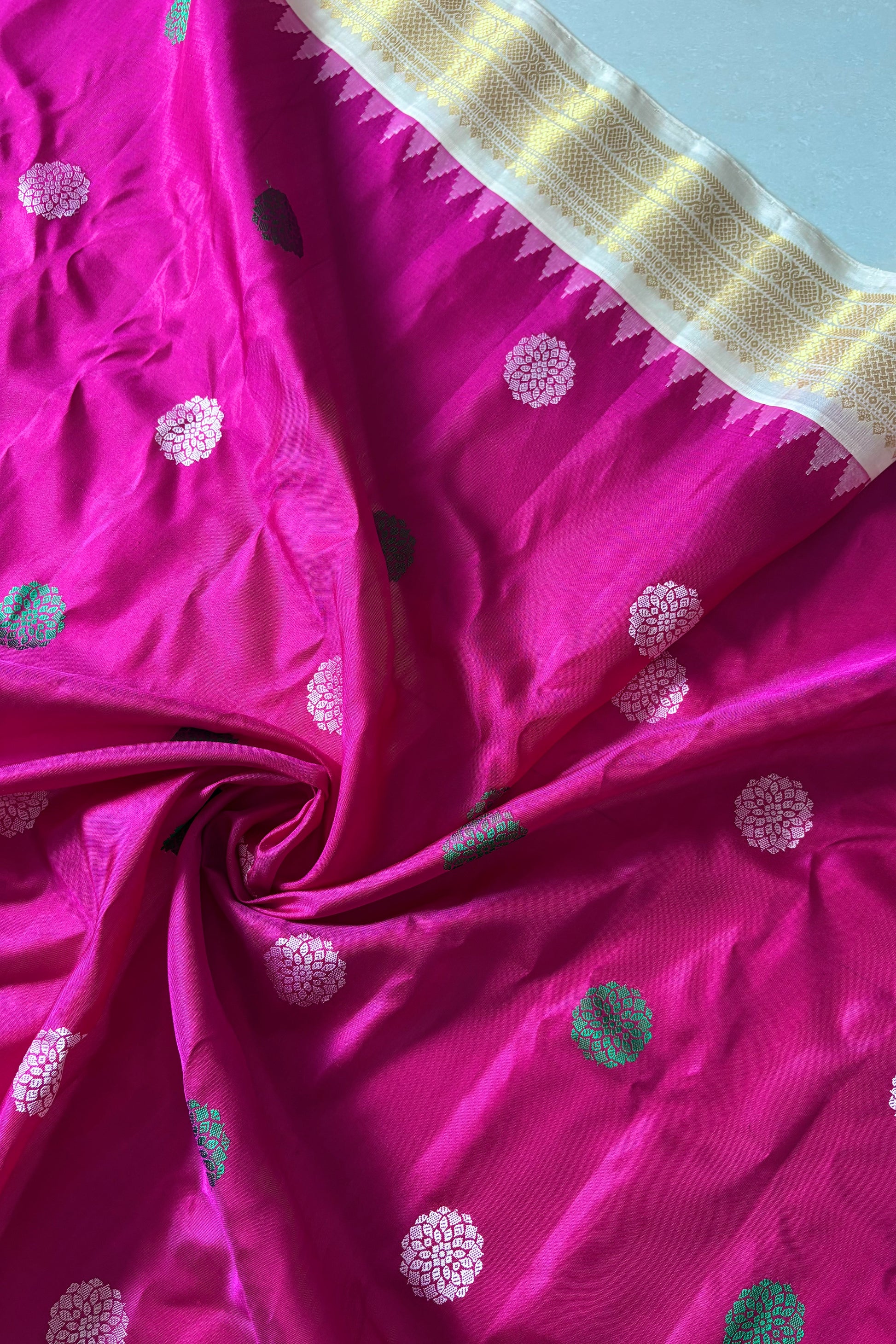 Gadwal silk saree, rani pink Gadwal saree, floral buta silk saree, cream gold border Gadwal saree, handwoven Gadwal silk, Silk Mark certified saree, festive silk saree, pure silk Gadwal, traditional Indian saree, Gadwal saree onlineThis saree is crafted with utmost care, and its handmade nature lends it an unbeatable uniqueness—small irregularities are a testament to its authenticity.