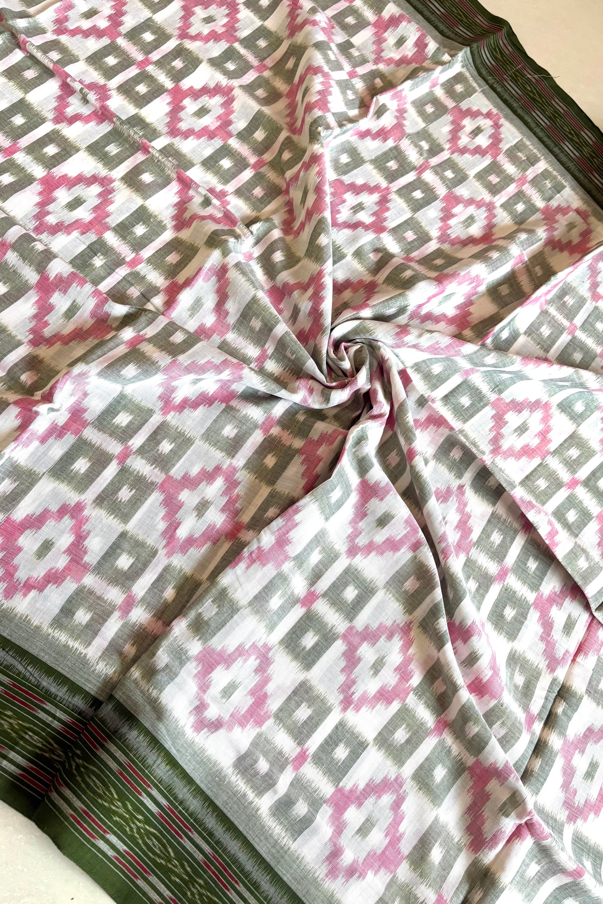 Odisha Ikkat Khandua Cotton Saree- White-Green