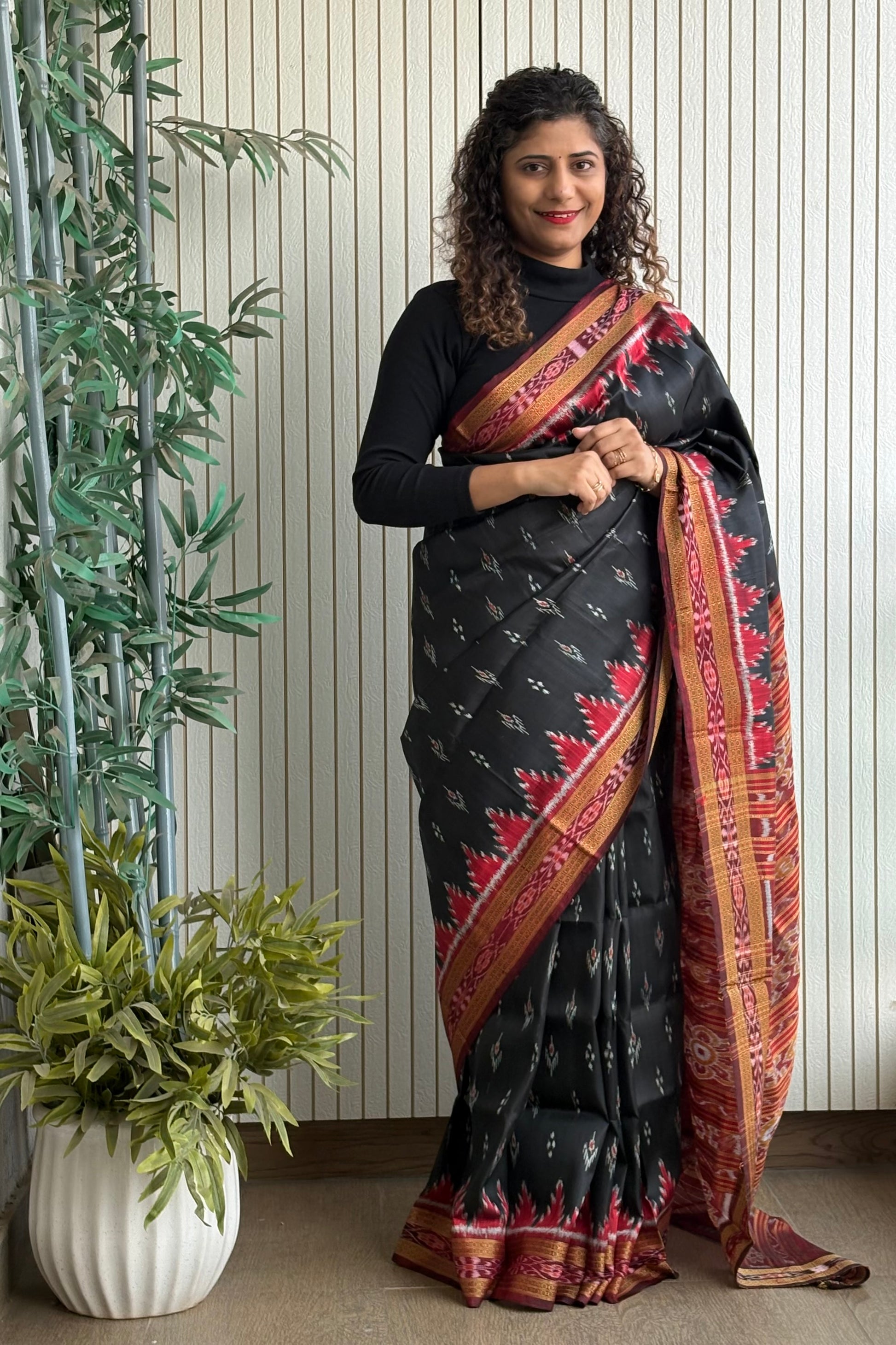 Mayura Chandrika, an age-old design in Nuapatna Ikkat has been a very popular pattern in cotton as well as Khandua silk sarees. This saree is in a gorgeous black color with red bandha border. A traditional design that has become quite popular these days owing to the attention Odisha Ikkat is getting worldwide.
