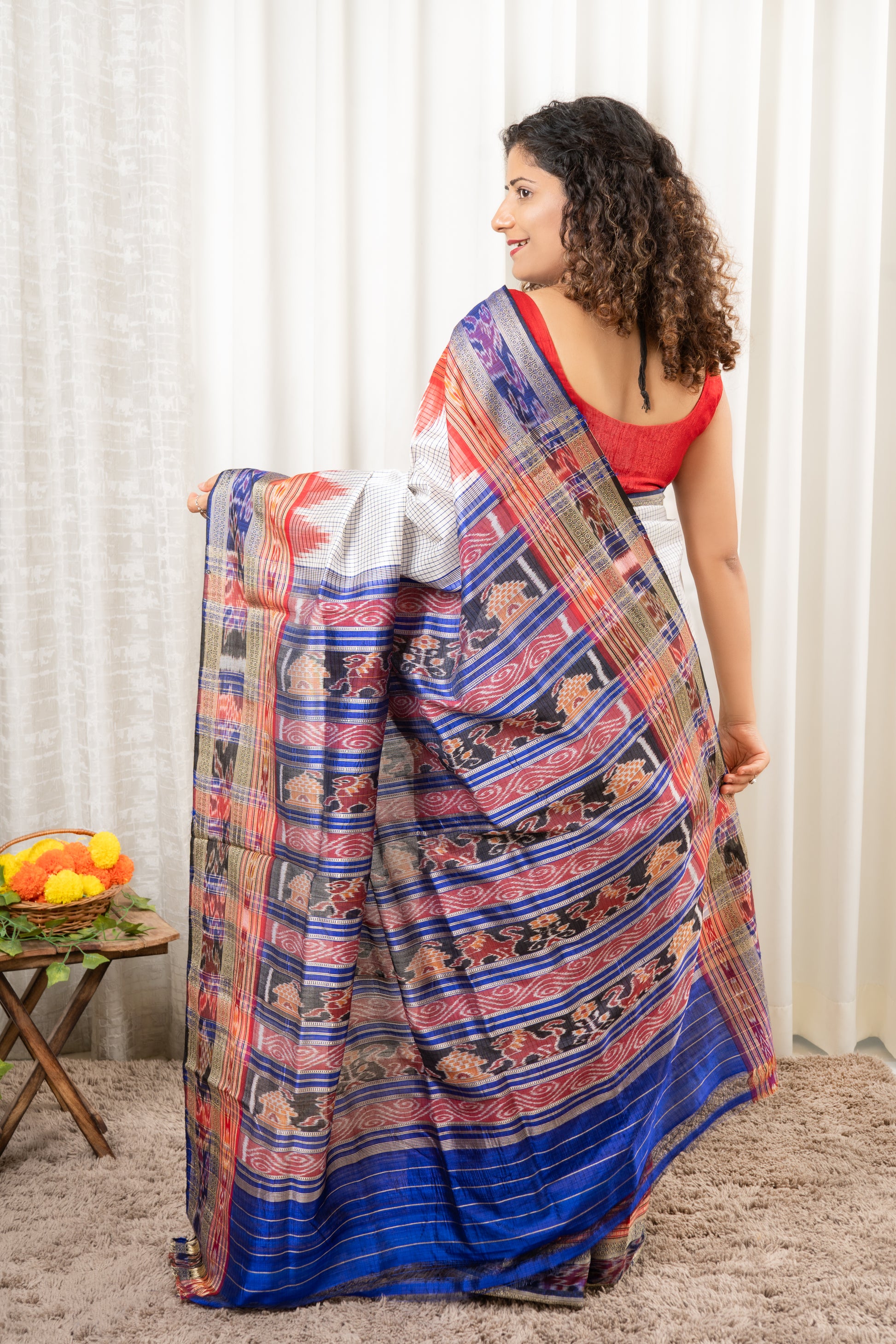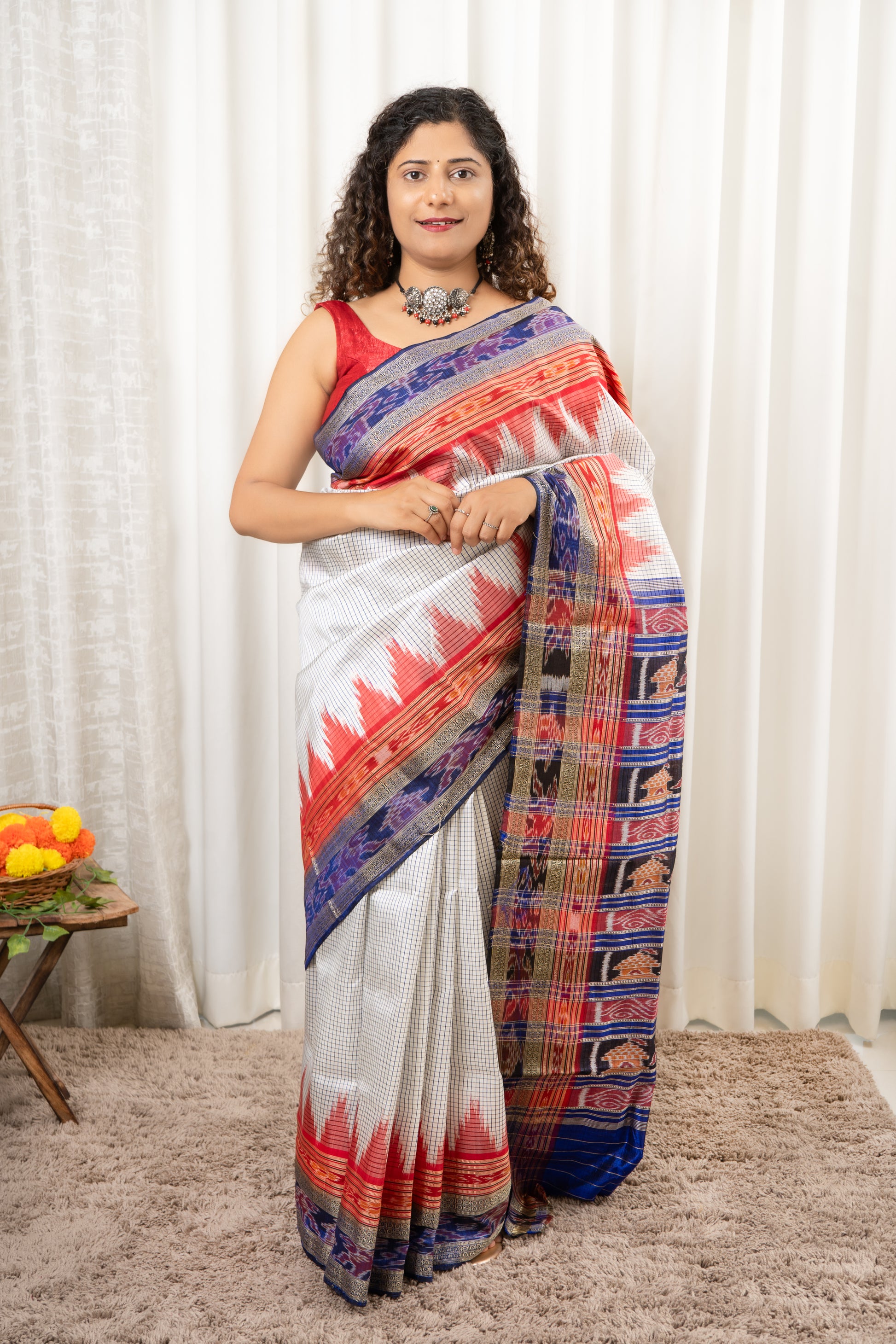 Khandua Pata is one of the most popular sarees from Odisha Handloom as it is also offered to be draped around Lord Jagannath of Puri. The pure mulberry silk khandua pata is also popular for being extremely light weight. These sarees have symbols and motifs inspired from our culture and mythology which are weaved on to the sarees using tie & dye Ikkat technique. This is also know as "bandha kala" and Khandua Silks are truly master pieces depicting culture of Odisha since 12th Century. These are available in both Silk and Cotton fabric. The true essence of a Khandua Sarees lies in the border and anchal that tells you stories if you have an eye for detail.